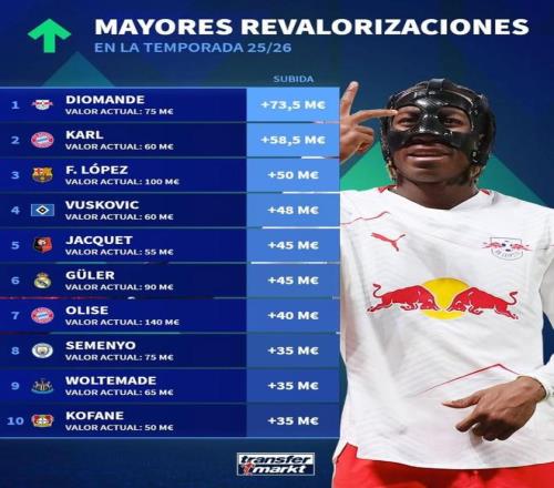 北京時(shí)間3月31日,德轉(zhuǎn)列出了本賽季至今世界足壇身價(jià)漲幅最高的10名球員,RB萊比錫邊鋒揚(yáng)-迪奧曼德暴漲7350萬(wàn)歐元位列第一,倫納特-卡爾、費(fèi)爾明-洛佩斯、居萊爾、奧利塞、塞門約以及沃爾特馬德上榜。