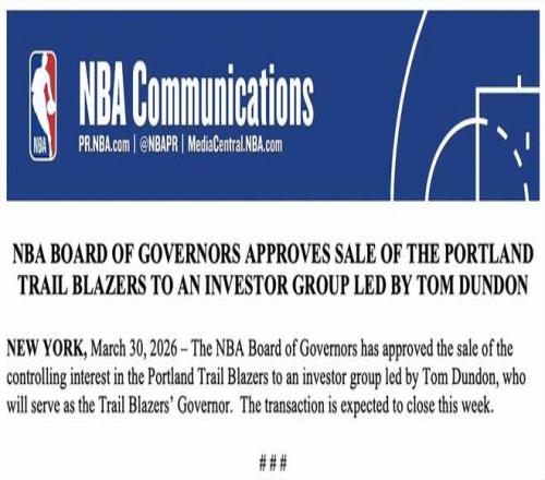 北京時間3月31日,NBA官方發(fā)布公告,聯(lián)盟董事會已批準將波特蘭開拓者隊的控股權(quán)出售給由湯姆-鄧登領(lǐng)導(dǎo)的投資集團,鄧登將擔(dān)任開拓者隊的董事。該交易預(yù)計于本周完成。這也意味著楊瀚森要正式換老板了。