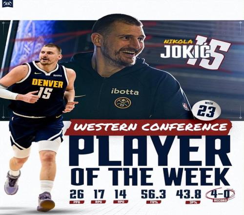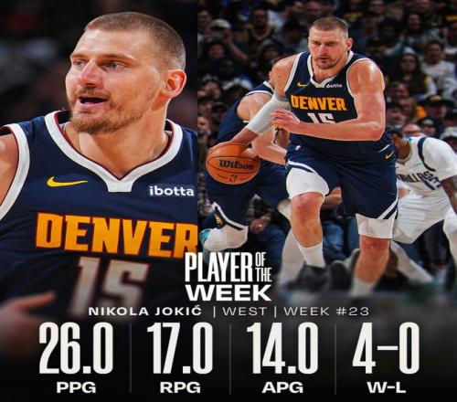 這是約基奇本賽季第三次斬獲該獎項,職業(yè)生涯至今已20次當選西部周最佳,位列掘金隊史首位。