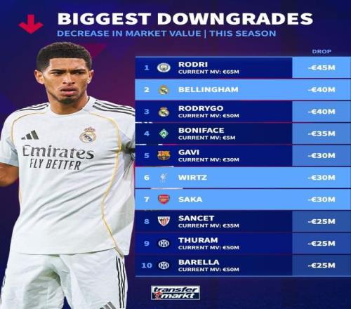 德轉(zhuǎn)盤點(diǎn)了本賽季目前球員身價(jià)下跌榜,其中羅德里下降4500萬歐最多,貝林、羅德里戈下降4000萬歐。