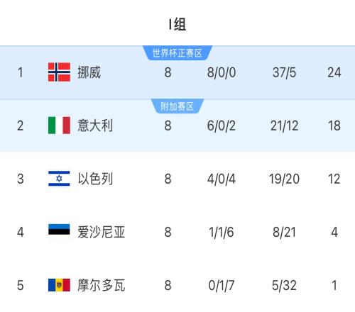 本屆世界杯歐洲預(yù)選賽階段,意大利在I組8輪6勝2負(fù),遭挪威雙殺導(dǎo)致藍(lán)衣軍團(tuán)排名小組第2無緣直通。