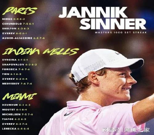 辛納剛剛跨賽季連奪巴黎、印第安維爾斯和邁阿密三站大師賽冠軍,位居ATP1990年設(shè)立大師賽以來歷史第二,僅次于西班牙戰(zhàn)神納達(dá)爾、塞爾維亞天王德約科維奇曾經(jīng)創(chuàng)造的大師賽四連冠。更加令人嘆為觀止的是,辛納創(chuàng)造了跨賽季大師賽34盤連勝的新紀(jì)錄,成為ATP1990年設(shè)立大師賽以來歷史第一人,遠(yuǎn)超歷史第二人德約科維奇曾經(jīng)創(chuàng)造的大師賽24盤連勝。