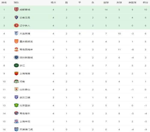 在積分榜上,成都蓉城3勝1平,拿到10分,高居榜首。云南玉昆、遼寧鐵人和大連英博都是6分,排名第2到第4。上海海港贏球之后,總積分達到1分,升到第9名。山東泰山2勝2負,0分,排名第11。北京國安輸球后,也是負1分,排名第13。上海申花負5分,排名第15。