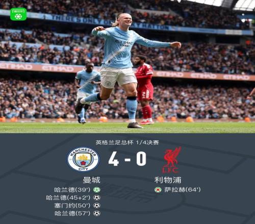 北京時(shí)間4月4日英格蘭足總杯1/4決賽,曼城對(duì)陣?yán)锲?。哈蘭德帽子戲法,塞門(mén)約傳射建功,薩拉赫丟點(diǎn)。最終比分曼城4-0利物浦晉級(jí)足總杯4強(qiáng)。