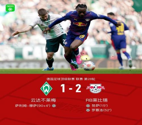 北京時間4月4日德國足球頂級聯(lián)賽第28輪,云達不萊梅主場對陣RB萊比錫。。努薩、羅慕洛分別破門。薩利姆-穆薩扳回一城。最終比分云達不萊梅1-2RB萊比錫。