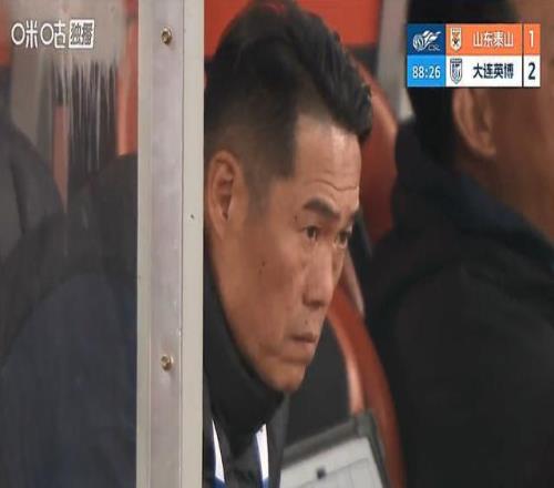 追回1分后,山東泰山一鼓作氣試圖再進1球,大連英博打起12分精神不再給機會。球隊遲遲無法追平比分,韓鵬在場邊來回兜圈......。相反,名義主教練宿茂臻卻穩(wěn)坐替補席(下圖),若有所思。
