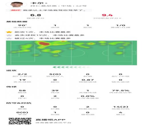 體育播報4月4日宣 拜仁在本輪德甲3-2逆轉(zhuǎn)絕殺弗賴堡,小將卡爾本場數(shù)據(jù)如下:
