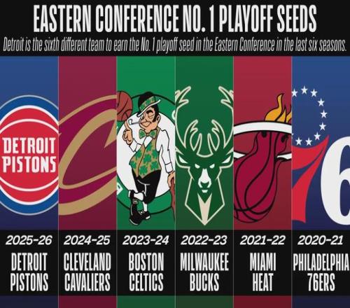 最近六個賽季,東部第一由六支不同的球隊輪莊:76人、熱火、雄鹿、凱爾特人、騎士和活塞。兩年之前,也就是2023-24賽季,活塞遭遇了28連敗,創(chuàng)造NBA單賽季連敗紀錄。當時活塞常規(guī)賽戰(zhàn)績14勝68負,全聯(lián)盟倒數(shù)第一。