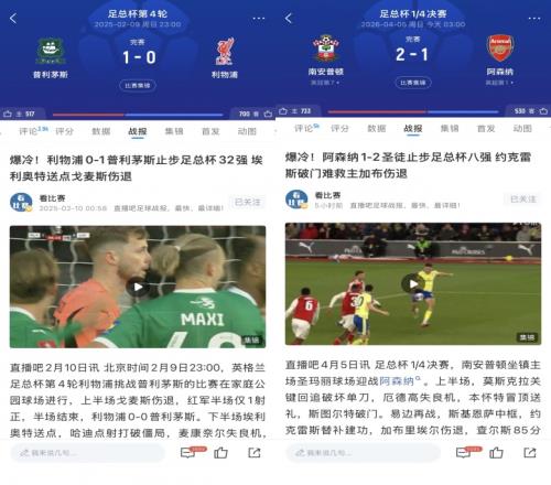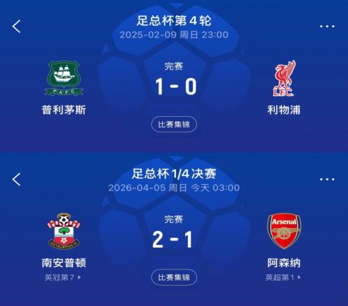 英冠不好惹去年英超第1足總杯負普利茅斯,今年英超第1負圣徒 直播吧 2026-04-05 16:26:09 體育播報04月05日宣 足總杯1/4決賽爆出冷門,英冠第7南安普頓2-1擊敗英超第1阿森納,槍手止步足總杯8強。上賽季足總杯也爆出冷門,英冠墊底的普利茅斯1-0擊敗英超第1利物浦,紅軍止步足總杯32強。 足球利物浦阿森納英超話題 上一篇: 太陽報:已退役12年的亨利周薪近10萬鎊,做評論員、投資涉獵頗多下一篇: 塔帥:追四冠王不是杯賽出局的原因,也不知道這是否有利聯(lián)賽爭冠