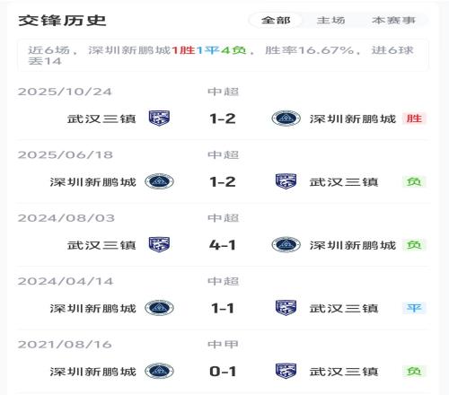 目前,深圳新鵬城1勝2負積3分排名聯(lián)賽第6,武漢三鎮(zhèn)1勝1平1負積-1分排名聯(lián)賽第12。