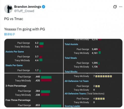 體育播報(bào)4月5日宣 前NBA球員詹寧斯發(fā)推對(duì)比了喬治和麥迪誰(shuí)更強(qiáng),寫(xiě)道:“我選擇喬治?!?/p>