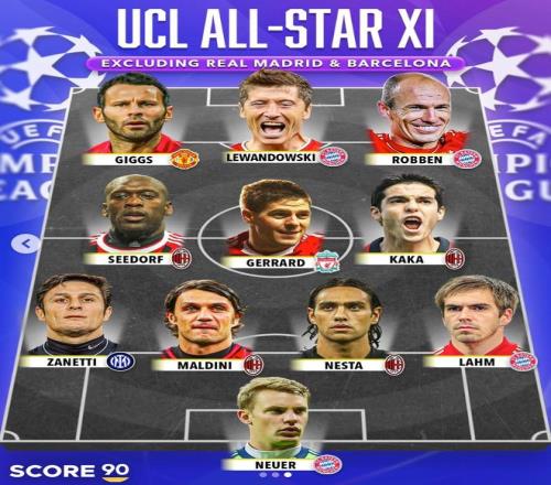 北京時(shí)間4月6日,Score90列出了自1992-93賽季改制以來(lái)歐冠的全明星陣容,C羅和梅西領(lǐng)銜,皇家馬德里占據(jù)8席。