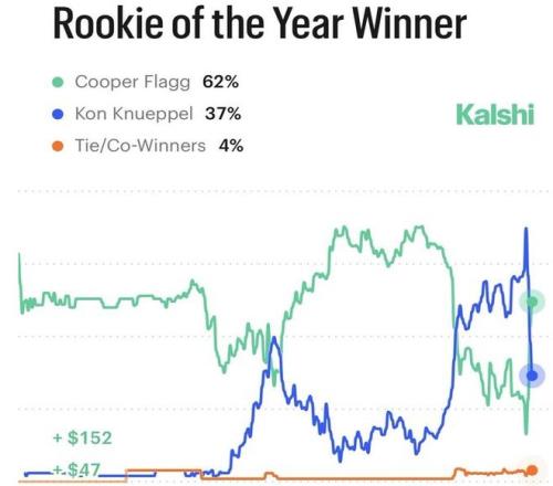 根據(jù)預測平臺Kalshi更新的本賽季最佳新秀概率,弗拉格憑借最近兩場的爆發(fā)表現(xiàn),他的獲獎概率飆升到62%,力壓克努佩爾佩爾37%,兩人共享獎項的概率是4%。
