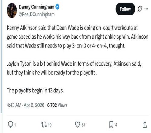 遭遇左大腳趾骨挫傷的泰森,傷病恢復(fù)進(jìn)度比韋德慢一些,但阿特金森表示球隊預(yù)計他能夠趕上季后賽。