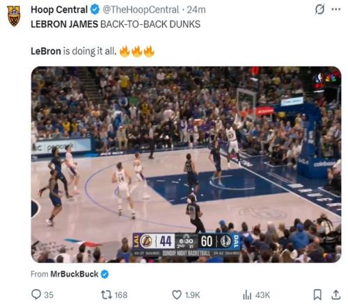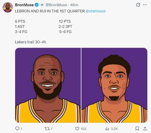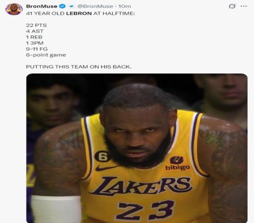 上半場41歲的勒布朗已經火力全開,11中9,三分1中1,拿到22分4助攻1籃板,湖媒盛贊死亡之瞳版本的勒布朗再度回歸了。