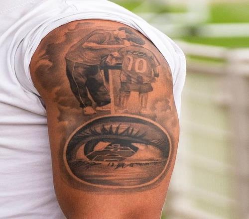 這個(gè)紋身是馬特烏斯18歲生日時(shí)紋的,當(dāng)時(shí)他父親允許他紋身。紋身圖案是一個(gè)穿著運(yùn)動(dòng)服和運(yùn)動(dòng)鞋的男人,將隊(duì)長(zhǎng)袖標(biāo)纏繞在馬特烏斯手臂的同一位置,他的背上有10號(hào),袖標(biāo)下方是一個(gè)眼睛的特寫,瞳孔中倒映著足球場(chǎng)。
