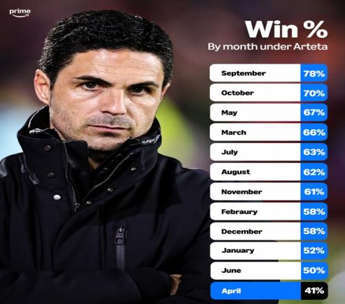體育播報(bào)4月6日宣 亞馬遜Prime盤點(diǎn)了阿爾特塔執(zhí)教期間阿森納各個(gè)月份的勝率,其中四月份41%最低。