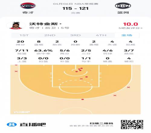 奇才次輪43號(hào)秀沃特金斯 登場(chǎng)43.7分鐘