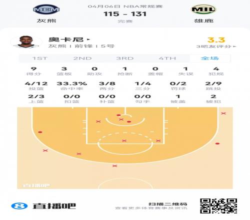 灰熊落選秀托比·奧卡尼 登場(chǎng)41.2分鐘