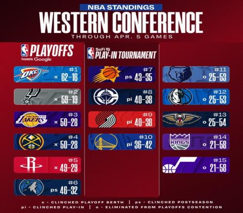 1.雷霆 | 2. 馬刺 | 3. 湖人 | 4. 掘金 | 5. 火箭