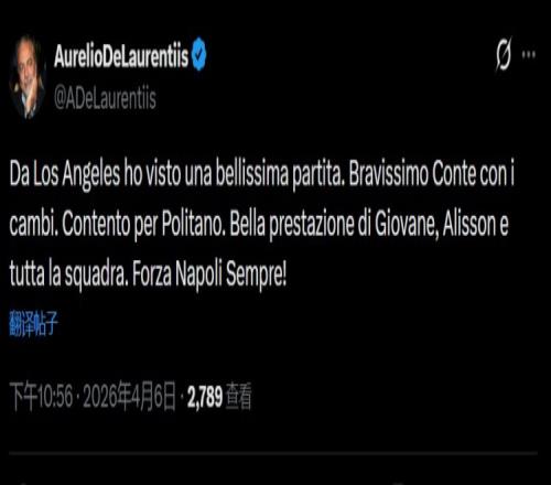 體育播報4月7日宣 在那不勒斯1-0擊敗米蘭奪回意甲第二名后,那不勒斯主席德勞倫蒂斯更新社交媒體。