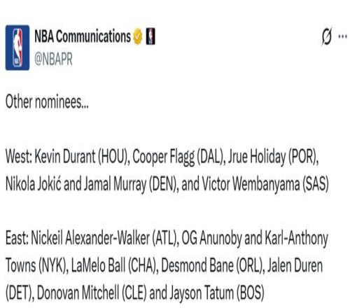 西部:火箭的凱文-杜蘭特、獨(dú)行俠的庫珀-弗拉格、開拓者的朱-霍勒迪、掘金的尼古拉-約基奇與賈馬爾-穆雷、馬刺的維克托-文班亞馬。