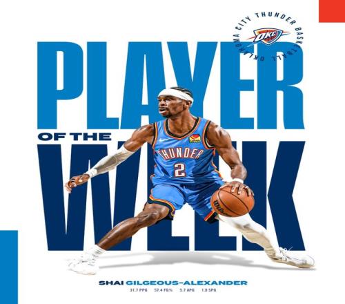 過去一周,亞歷山大場均砍下31.7分5.3籃板5.7助攻,幫助雷霆取得3勝0負(fù)的戰(zhàn)績。