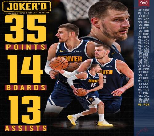 2.約基奇拿到本賽季第33次三雙聯(lián)盟第一;