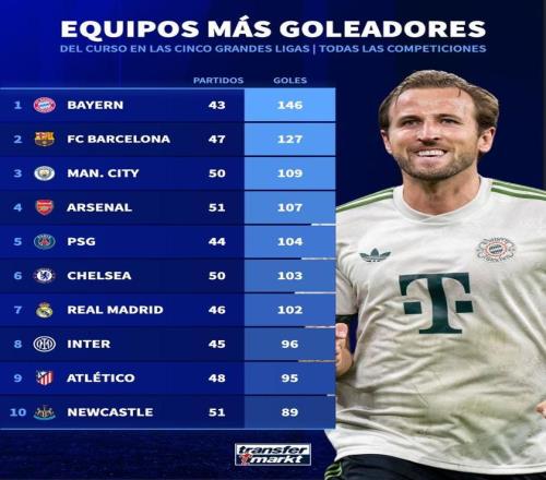 本賽季五大聯(lián)賽球隊(duì)進(jìn)球榜:拜仁43場(chǎng)146球第1,巴薩127球第2
