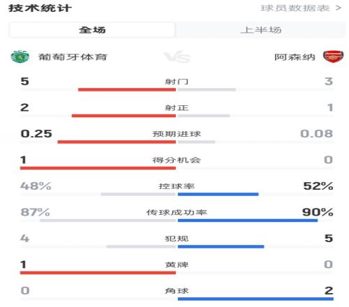 葡體半場(chǎng)00阿森納數(shù)據(jù):射門53,射正21,控球率48%52%