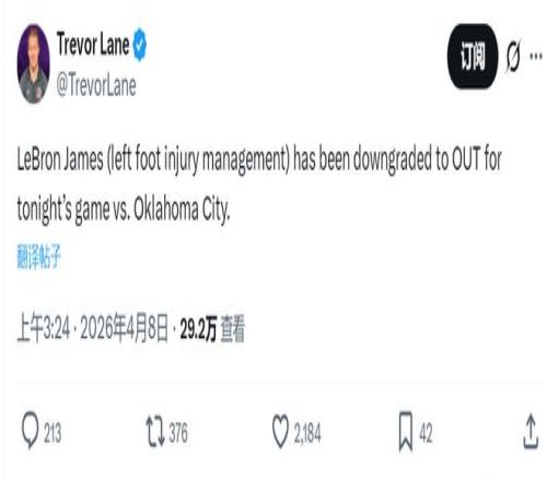 北京時(shí)間4月8日,洛杉磯湖人更新傷病報(bào)告,詹姆斯因左腳傷病管理,將缺席今天和雷霆的比賽。此外,東契奇(左腿筋拉傷)、里夫斯(左側(cè)腹斜肌拉傷)和斯瑪特(右腳踝挫傷)都不打。湖人暫列西部第四,落后第三掘金0.5個(gè)勝場(chǎng)。