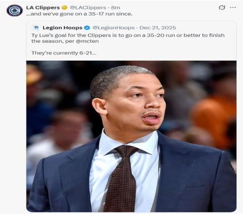 在2025年12月21日快船是6勝21負,但隨后快船取得35勝17負,目前戰(zhàn)績41勝38負,快船官方為泰倫盧點贊,因為此前泰倫盧說余下55場比賽要拿35勝20負。