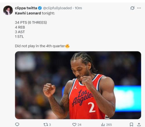 52戰(zhàn)贏35場超額完成指標!快船官方為泰倫盧點贊:小卡三節(jié)34分