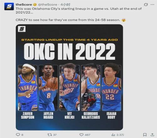 雷霆首發(fā):亞歷山大、阿杰伊-米切爾、多爾特、霍姆格倫、哈滕。過去22場雷霆豪取20勝2負,只輸給了活塞和凱爾特人。美媒TheScore曬出雷霆2021-22賽季常規(guī)賽收官階段的首發(fā):“雷霆從24勝58負一路走來,太不可思議了?!?/p>