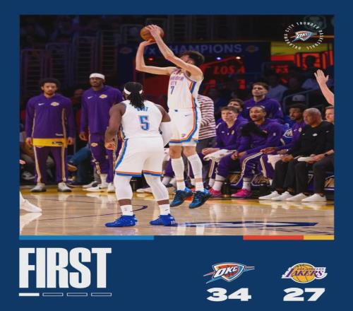 蒂米長期在發(fā)展聯(lián)盟征戰(zhàn),本賽季在南灣湖人場均能砍下23.7分8.5籃板4.8助攻,入選了發(fā)展聯(lián)盟最佳陣容二陣。說回今天的比賽,首節(jié)湖人送出10次助攻,比雷霆還多3次。第一節(jié)后半段,亞歷山大發(fā)力,雷霆領(lǐng)先到5分以上。