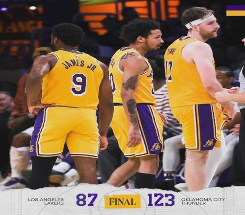 亞歷山大25分8助2斷、以賽亞-喬18分2板、霍姆格倫15分10板2斷2帽、麥凱恩15分。湖人這邊,艾頓4中1拿到3分3籃板1蓋帽,正負值-26。拉拉維亞7中1得到2分7板2斷,正負值-19。布朗尼9中2拿4分2板2助1斷,正負值-25。