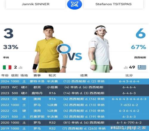 本周蒙特卡洛大師賽,辛納奪冠道路荊棘密布,步步艱辛。首輪輪空之后,辛納第二輪首戰(zhàn)法國左手將安貝爾,應(yīng)該過關(guān)無虞;第三輪1/8決賽可能對陣希臘海盜西西帕斯,難度急劇上升。西西帕斯雖然現(xiàn)在世界排名已經(jīng)滑落到40開外,但他曾經(jīng)三奪蒙特卡洛大師賽冠軍(2021、2022、2024年),一次闖進(jìn)法網(wǎng)決賽(2021年),乃是公認(rèn)的95后紅土頂尖高手。兩人職業(yè)生涯至今交鋒九次,西西帕斯六勝三負(fù)領(lǐng)先,其中紅土交鋒戰(zhàn)績更是四勝一負(fù)領(lǐng)先。2024年蒙特卡洛大師賽半決賽,正是西西帕斯三盤戰(zhàn)勝辛納,粉碎了辛納職業(yè)生涯首次闖進(jìn)紅土大師賽決賽的夢想。
