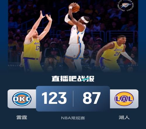比賽開始,雷霆反客為主打出6-0的開局,湖人展開反擊,蒂米內(nèi)外開花獨(dú)得10分幫助球隊(duì)頑強(qiáng)咬住,以賽亞·喬外線開炮連中3記三分,湖人極為頑強(qiáng),八村塁內(nèi)外開花抹平分差,卡魯索力戰(zhàn)舊主連中2記三分,雷霆打出11-0的攻擊波確立兩位數(shù)優(yōu)勢,半場戰(zhàn)罷雷霆65-47領(lǐng)先湖人。易邊再戰(zhàn),八村塁連續(xù)暴扣,但雷霆打出16-3的攻擊波擴(kuò)大優(yōu)勢,亞歷山大反擊將分差拉開到30分,末節(jié)雷霆延續(xù)火力一度將優(yōu)勢擴(kuò)大到40分,雙方輪換陣容耗完剩余時(shí)間。最終,雷霆123-87大勝殘陣湖人,最近兩戰(zhàn)湖人共贏了79分,球隊(duì)迎來6連勝。
