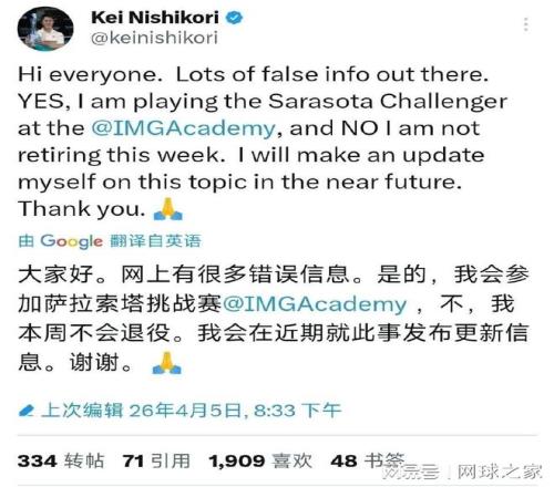 昨天,一則新聞?wù)痼@網(wǎng)壇——日本名將錦織圭宣布“本周退役”!消息一出,引發(fā)了整個互聯(lián)網(wǎng)的熱議,然而,今天,錦織圭卻發(fā)文澄清退役傳聞,他強調(diào),盡管自己目前確實已進(jìn)入退役倒計時,但截至目前自己還沒有具體的退役打算。