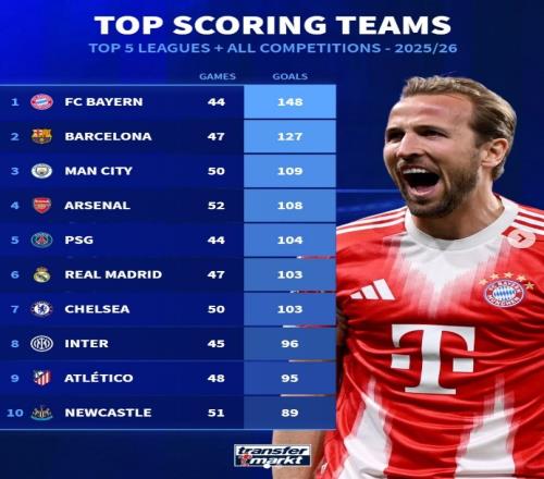 本賽季五大聯賽球隊總進球榜:拜仁148球斷層領跑,巴薩次席