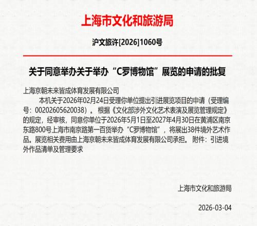 上海市文化和旅游局批復:同意5月至明年4月舉辦“C羅博物館”