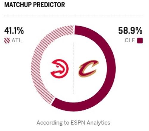 ESPN今日公布了本場(chǎng)勝率預(yù)測(cè),騎士為58.9%,老鷹41.1%。
