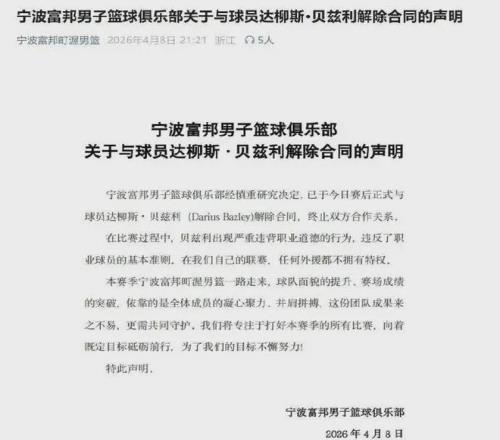 寧波隊絲毫不慣著,以貝茲利出現(xiàn)嚴(yán)重違背職業(yè)道德行為為由,直接讓他卷鋪蓋走人。
