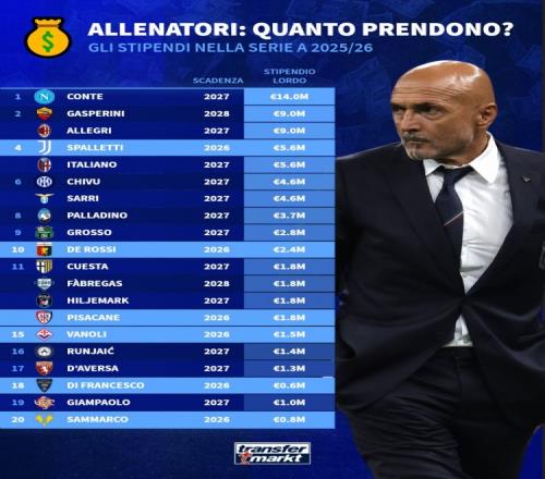 意甲各隊主帥年薪排行:孔蒂1400萬歐居首,阿萊格里900萬歐次席