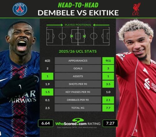 登貝萊(巴黎):6首發(fā)、2替補(bǔ),2球、1助攻。場(chǎng)均1.9射門(mén)、1.5關(guān)鍵傳球、0.1過(guò)人。預(yù)期進(jìn)球值2.5。場(chǎng)均6.64分