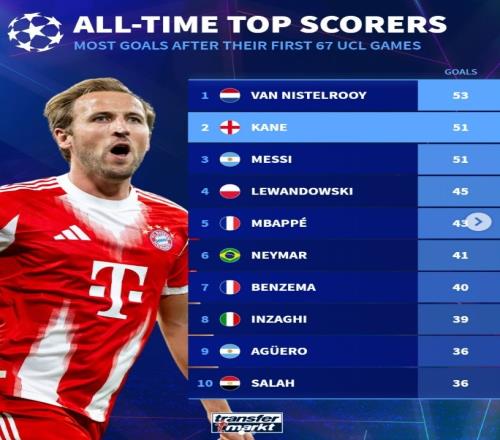 凱恩生涯67場(chǎng)歐冠進(jìn)51球,相同場(chǎng)次進(jìn)球數(shù)僅次于范尼,與梅西相同