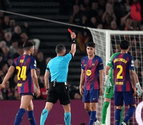 這就是歐冠的殘酷。第42分鐘,小西蒙尼形成單刀,庫巴西身后犯規(guī)。裁判先是黃牌,VAR介入后直接改紅牌。19歲的巴薩后防核心就這樣結(jié)束了比賽。他成為歐冠歷史上首位20歲前兩次被罰下的球員,上次是對本菲卡,這次是在諾坎普。