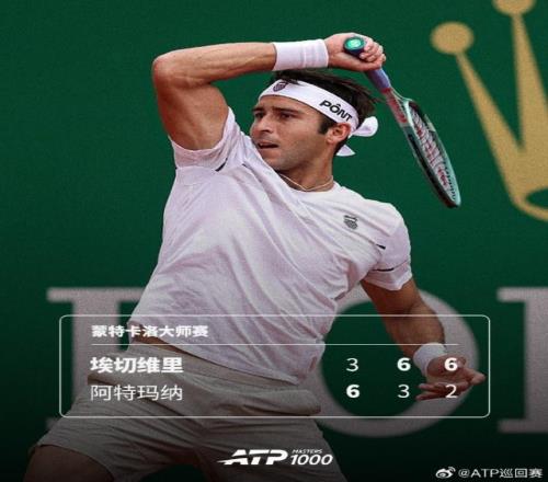 蒙特卡洛大師賽第二輪,埃切維里逆轉(zhuǎn)法國選手阿特瑪納,首次晉級賽會16強。三盤比分:3比6、6比3、6比2。埃切維里第三輪他將挑戰(zhàn)賽會頭號種子阿爾卡拉斯。
