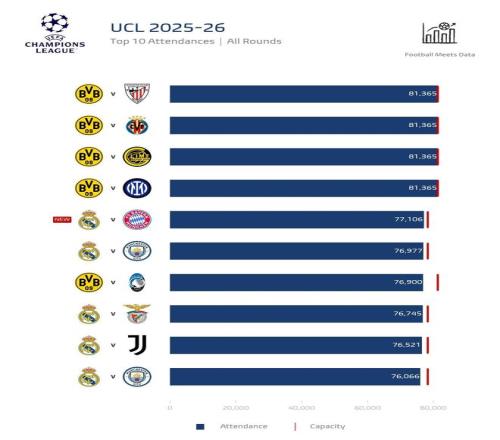 歐洲冠軍聯(lián)賽2025-26賽季觀眾人數(shù)榜單