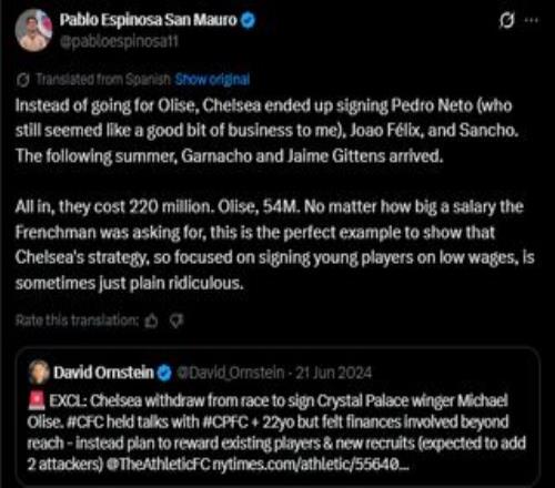 球迷Pablo San Mauro把賬單甩到Reddit上,評論區(qū)直接炸了。有人翻舊賬:「奧利斯根本不想來」——立刻被反駁。真相是2023年切爾西因「違規(guī)接觸」被水晶宮抓包,奧利斯順勢續(xù)約漲薪;等到2024年再出手,拜仁的工資報價藍(lán)軍根本跟不起。